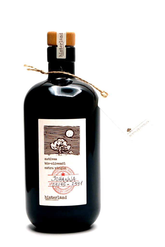 hinterland organic es un aceite de oliva virgen extra ecológico que combina un origen milenario en la zona de Villena, con una elaboración ultramoderna y un cultivo ecológico muy consciente que sostiene un importante tejido social y cultural. Es una cuidada combinación de variedades: Rojal, Cornicabra y Changlot de Alicante son mayoritarias y también tiene algunos matices de Arbequina y Picual. Cosechadas todas a principios de noviembre y elaboradas a conciencia en Villena con una de las maquinarias más modernizadas de toda la región, que es manejada por un equipo de profesionales especializado y encabezado por Juan Carlos Beneyto, el exigente maestro de la almazara.